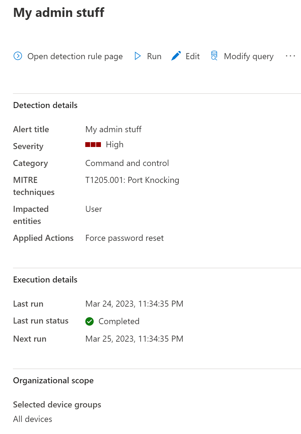 Custom detections work in conjunction with advanced hunting, which provides a powerful, flexible query language that covers a wide range of network event and system information. You can configure them to run at regular intervals, generating alerts and taking action whenever there are matches.
