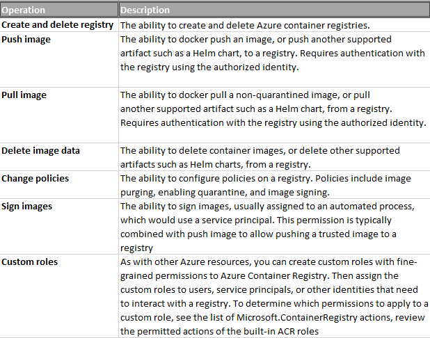 | Role/Permission | Access Resource Manager | Create/delete registry | Push image | Pull image | Delete image data | Change policies | Sign images |