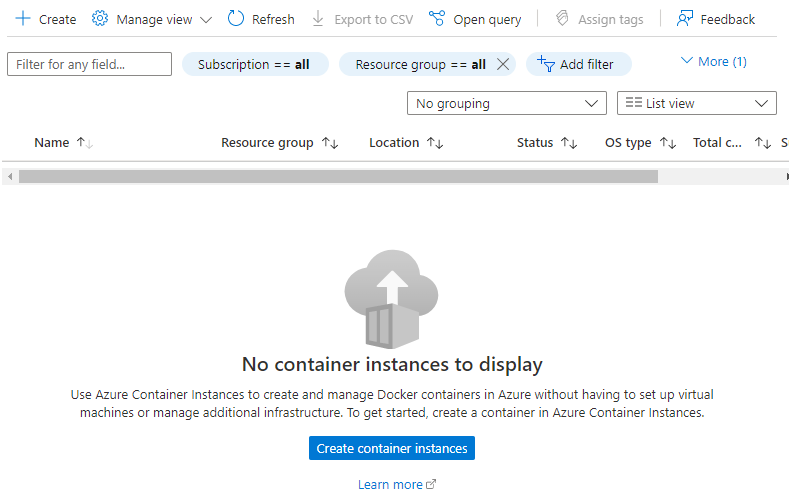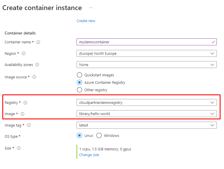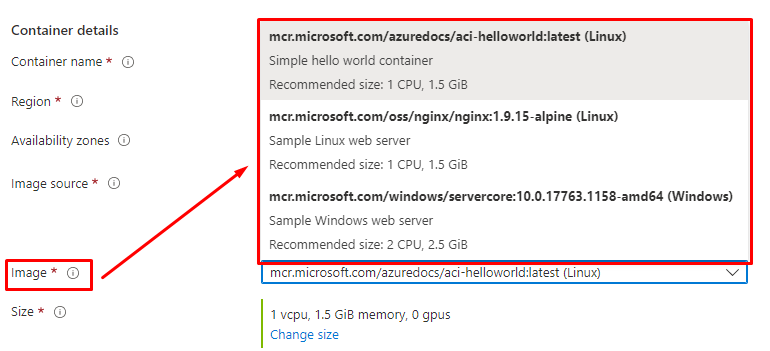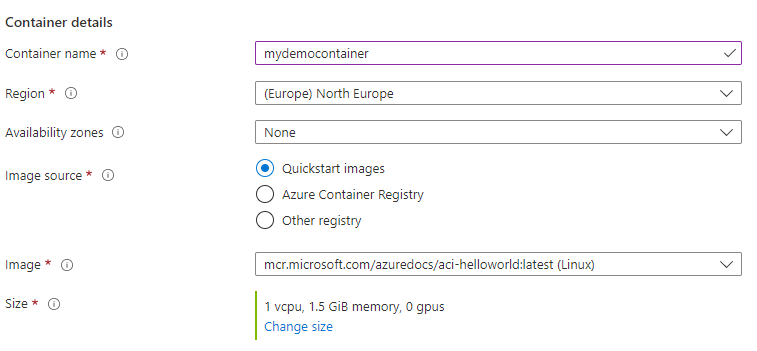 - 'Private' will allow you to choose a new or existing virtual network for your container instance. This is not yet available for Windows containers.