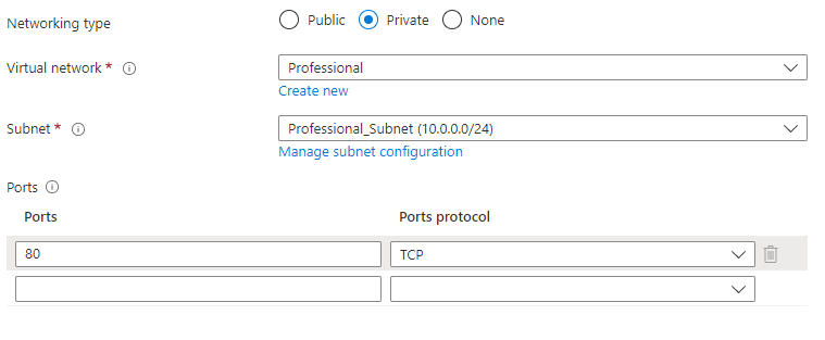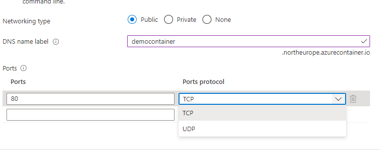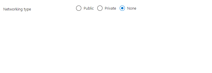 - 'None' will not create either a public IP or virtual network. You will still be able to access your container logs using the command line.