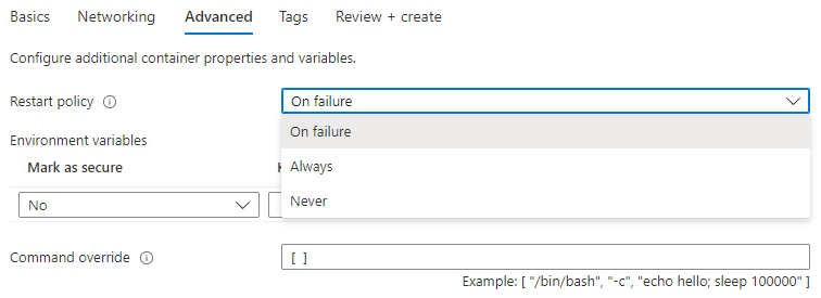The first command to execute within the container. Separate each command with a comma and a space as seen in the example. If you're using values that contain sensitive information like passwords in the command override field, it's recommended that you use a secure environment variable to get it into the container instead, and reference the container.