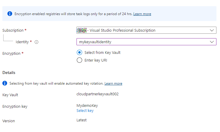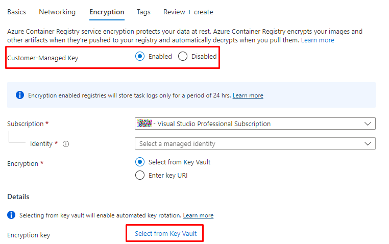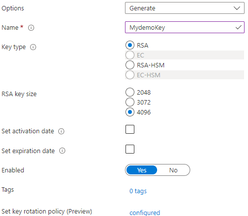 In the next screen you can choose your own key to encryption. If you have a Key Vault premium, you can also use Managed HSM pools to store the keys.
