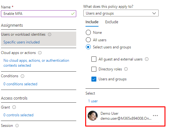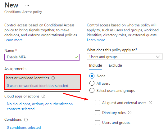 In here You can choose to include on exclude users, roles or groups. A nice option is also to Enable something with Conditional Access only to Guest and External users that reside or will be invited to Your tenant.