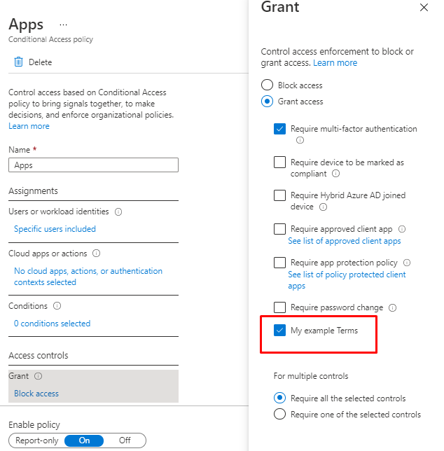 In the Grant section You will define to block the user matching the policy or Grant with controls.