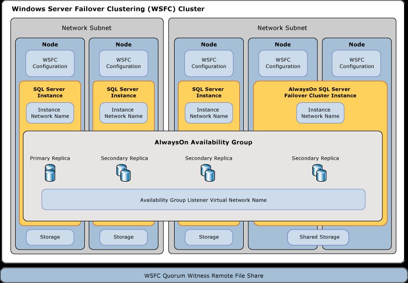 Hi, This time I will be blogging about SQL databases. First a little about history. SQL databases had (and still have) a significant part in the structure of a software. They contain storage for the data and configuration for nearly all Microsoft built products. The only one that I cant think of that don't need is Exchange. Exchange has it own The Extensible Storage Engine (ESE) also known as JET database. All the others rely on SQL, either the Express versions (ex. AAD Connect, SFB on-premises standalone etc.) or the full pledged version of SQL (CRM, ADFS with more than 5 nodes etc.) And you always had to make sure about service accounts for agents and db itself, rights users in the DB, backups, Disaster recovery, Fail-overs, updates, tuning performance with the underlying server etc. The following diagram present the really old-school clustering with identical hardware, firmware, updates.