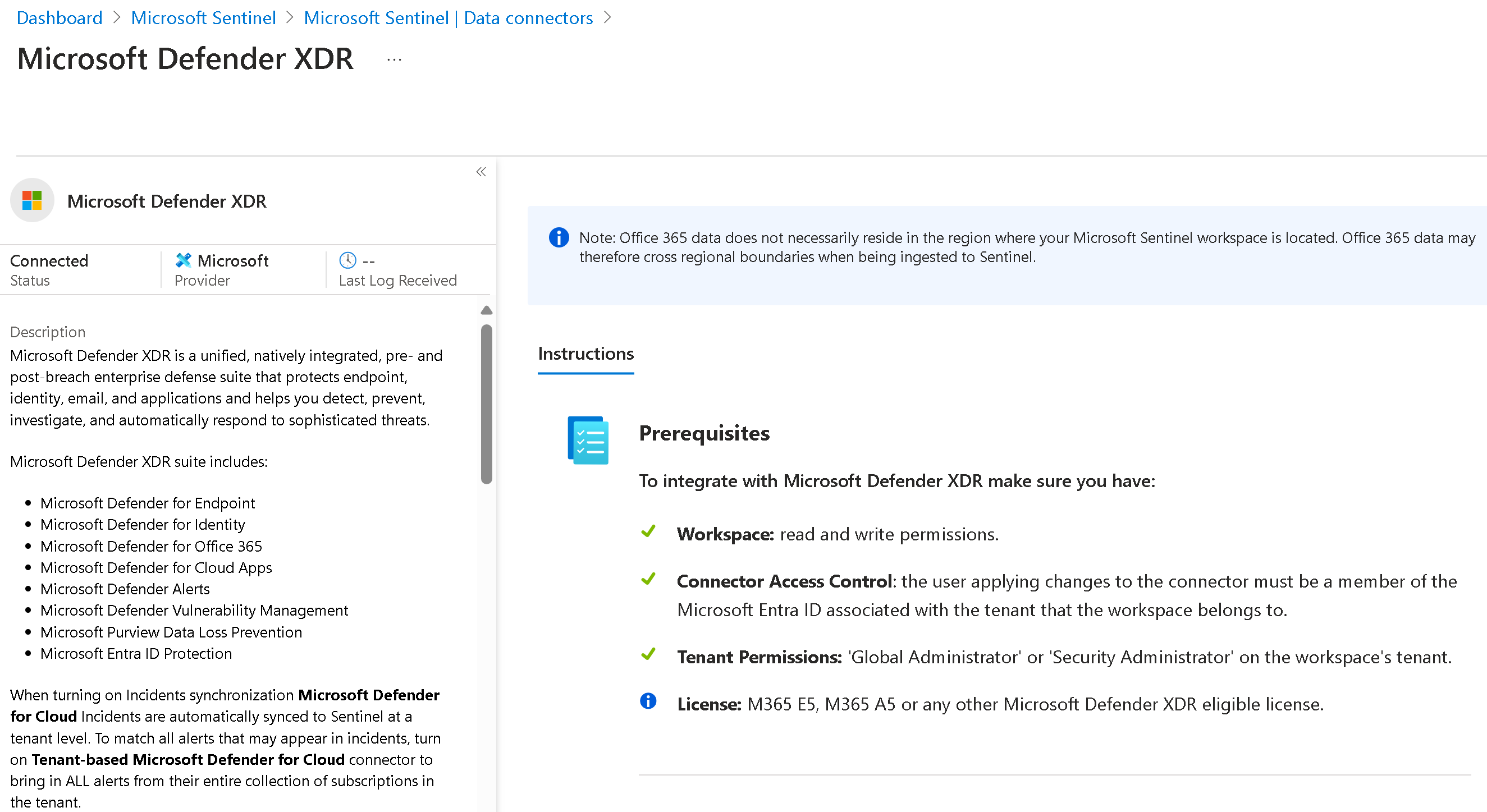 - Recommendation: Disable Microsoft Sentinel incident creation rules for XDR-integrated products (Defender for Endpoint, etc.) to prevent duplicates. This can be done in the connector page.