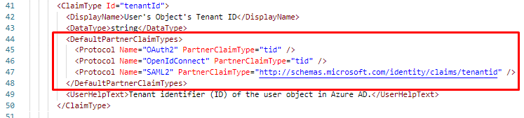 In the base file, there is also PartnerClaimTypes, partner claims come from the authenticating (source Azure AD). TID in example is the Tenant ID of the source Azure AD, you can use this inside Your tokens later.