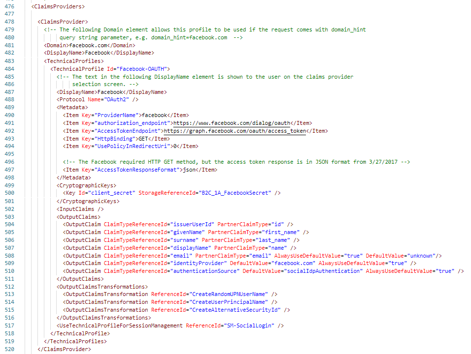 In this file You will also define those Identity providers. In here Facebook is still there but You can remove the whole section from <ClaimsProviders> to </Claimsproviders> if not needed.