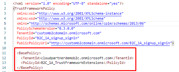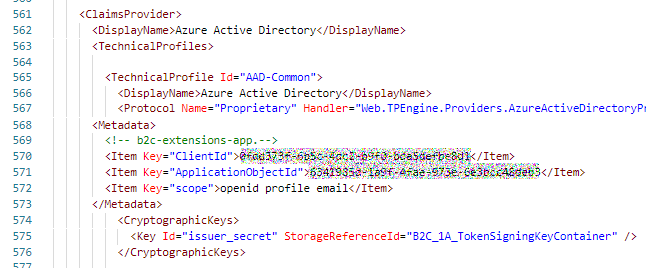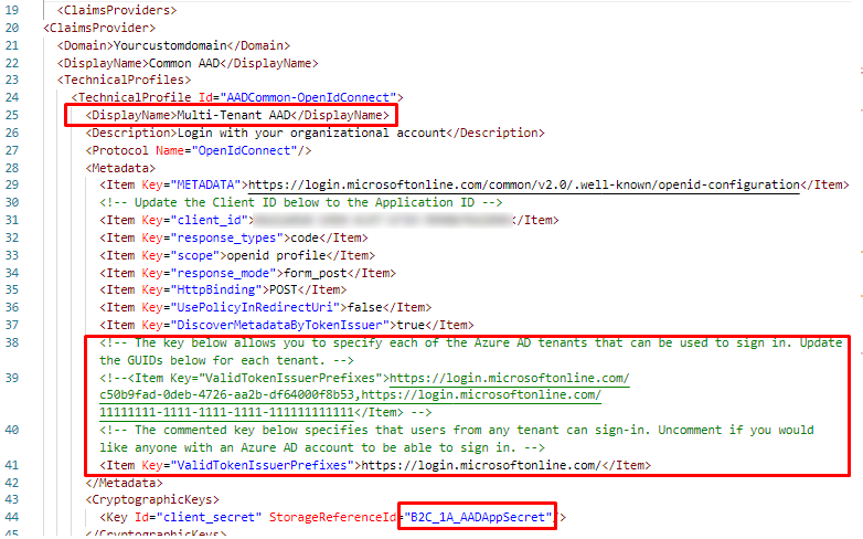 In here You will define the ClaimsProviders for the Multi-tenant. Like it says in the xml-file, add Tenant ID's You want to allow or don't add any if need to use as multi-tenant. AADAppSecret if the secret from Multi-tenant App that is inside your Linked Azure AD not B2C.