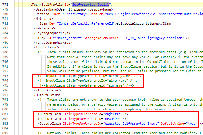 And also removing the claims from SelfAsserted-Social technical profile. This will disable the profile edit screen as we don't need it.