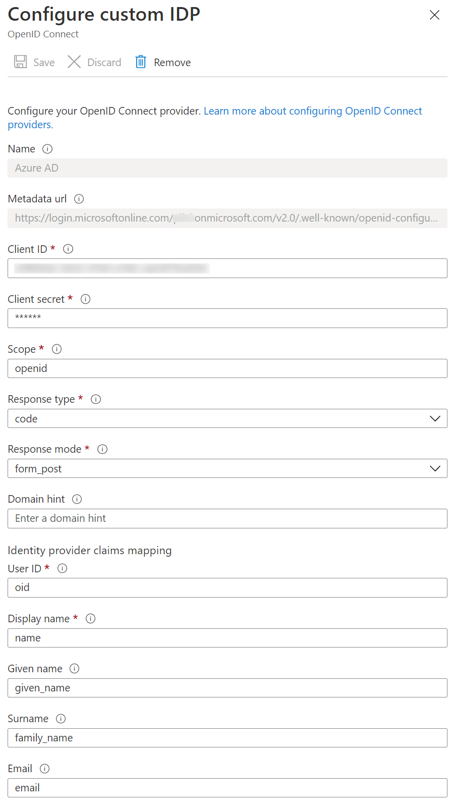 For example, https://login.microsoftonline.com/contoso.onmicrosoft.com/v2.0/.well-known/openid-configuration. If you use a custom domain, replace contoso.com with your custom domain in https://login.microsoftonline.com/contoso.com/v2.0/.well-known/openid-configuration.