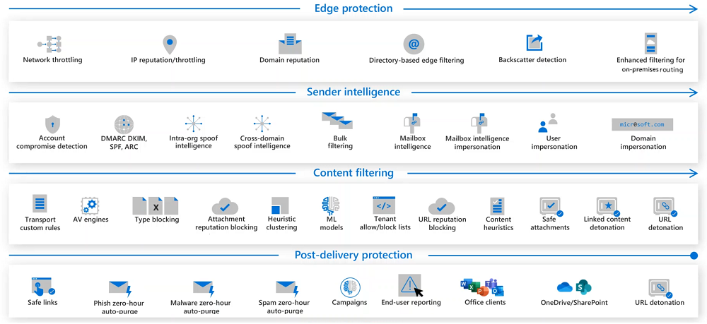 | Edge Protection | First line of defense against known threats | Network throttling (DoS protection) IP/Domain reputation filtering Directory-based filtering (blocks directory harvesting) Backscatter detection (prevents NDR attacks) Enhanced Filtering for Connectors (identifies true message source) |