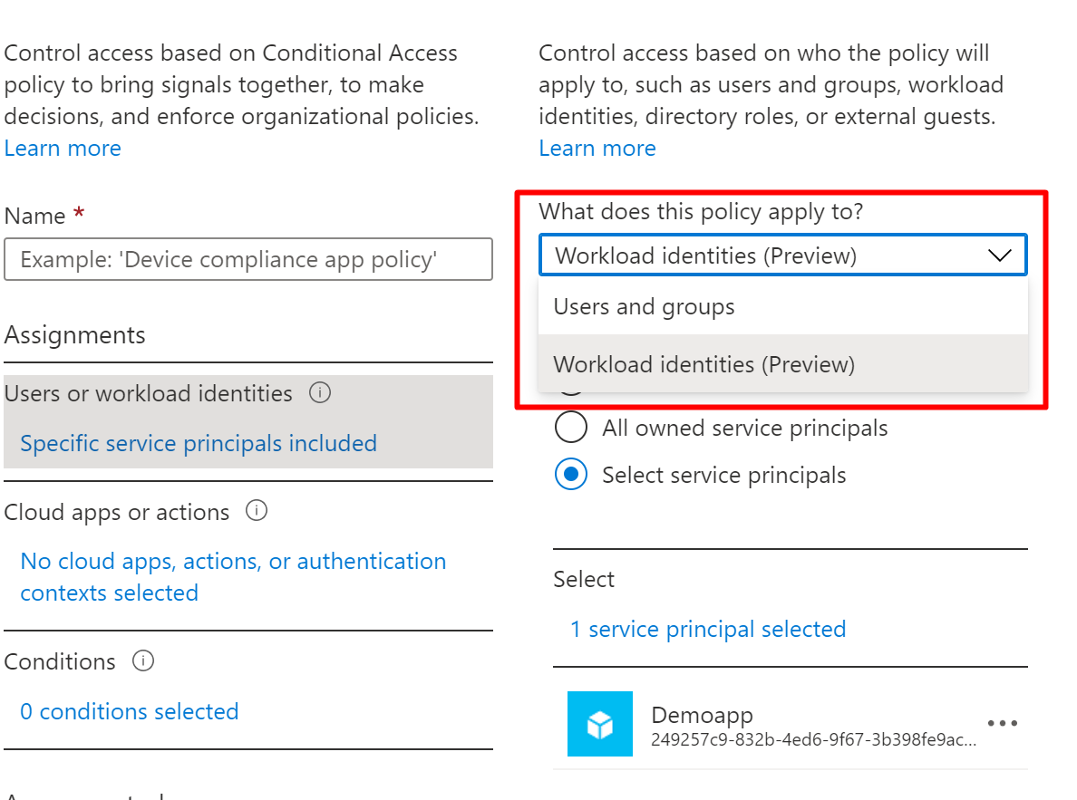 Now you can also choose Workload identities to policy scope not only users and groups.