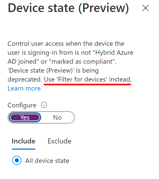 Microsoft is removing Device state and you have to use Filter for devices in the future.